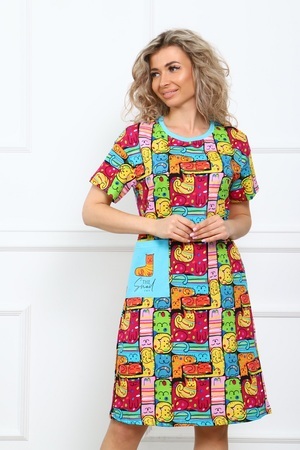 Туника женская прямого кроя с короткими рукавами, два кармана: один в левом боковом шве, и один накладной на полочке с очаровательным, уютным принтом котейки. Комфорт 100%-ого хлопка.