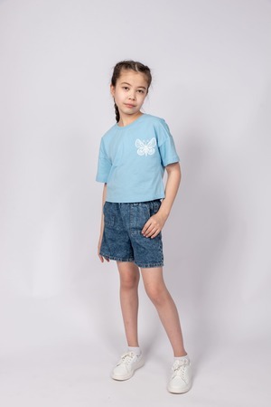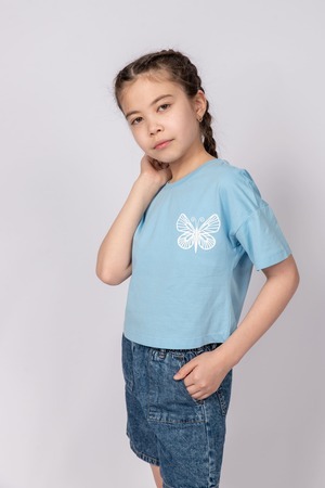 Футболка для девочки укороченная выполнена из 100% хлопка. Футболка прямого силуэта, со спущенным плечом, коротким рукавом. Благодаря эластичной горловине, выполненной из рибаны, футболку удобно снимать и надевать. На полочке принт Шелкография со вспенкой. Материал не растягивается и не деформируется.