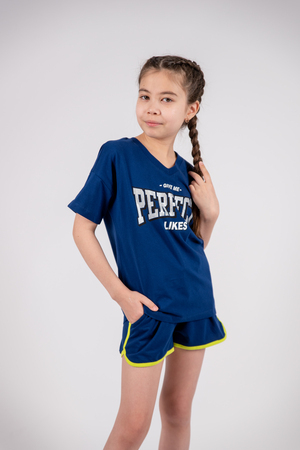 Футболка для девочки выполнена из 100% хлопка. Футболка прямого силуэта, со спущенным плечом, коротким рукавом. Горловина имеет V-вырез. На спинке принт Шелкография с глиттером. Надпись переводится как "Поставь мне идеальные лайки". Материал не растягивается и не деформируется.