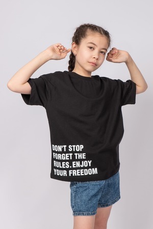 Футболка свободного силуэта (оверсайз) с коротким рукавом. Благодаря эластичной горловине, выполненной из рибаны, футболку удобно снимать и надевать. На полочке принт Шелкография. Надпись переводится как "Не останавливайся; Забудь о правилах; Наслаждайся своей свободой". Материал не растягивается и не деформируется.