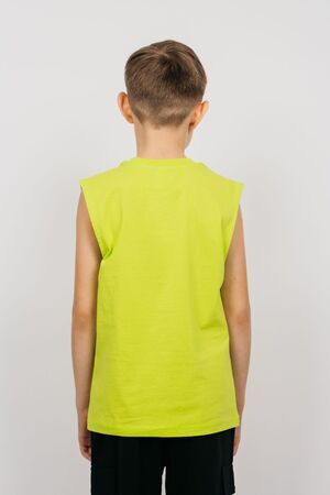 Майка для мальчика выполнена из 100% хлопка. Майка прямого силуэта. Благодаря эластичной горловине, выполненной из рибаны. майку удобно снимать и надевать. Пройма внутри обрабатывается бейкой из основного полотна. На полочке принт шелкография. Надпись переводится как "Время отдыхать под пальмой". Материал не растягивается и не деформируется.