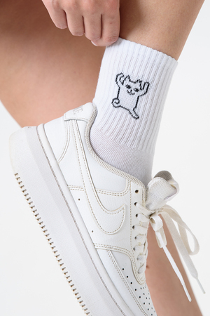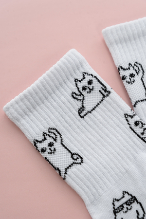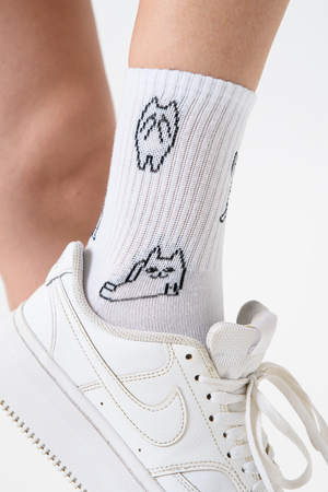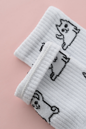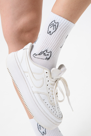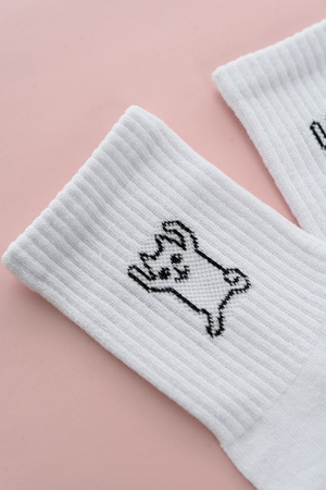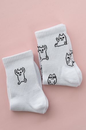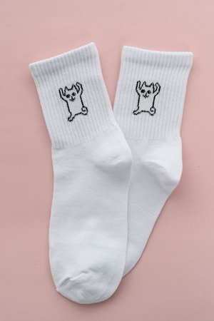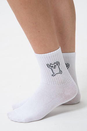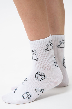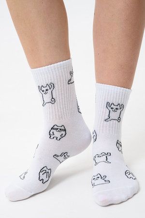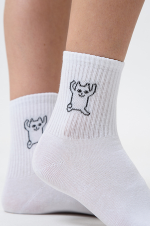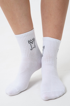 Белые женские носки, резинка на всей верхней части носка. В комплекте 2 пары, на каждой паре свой рисунок.