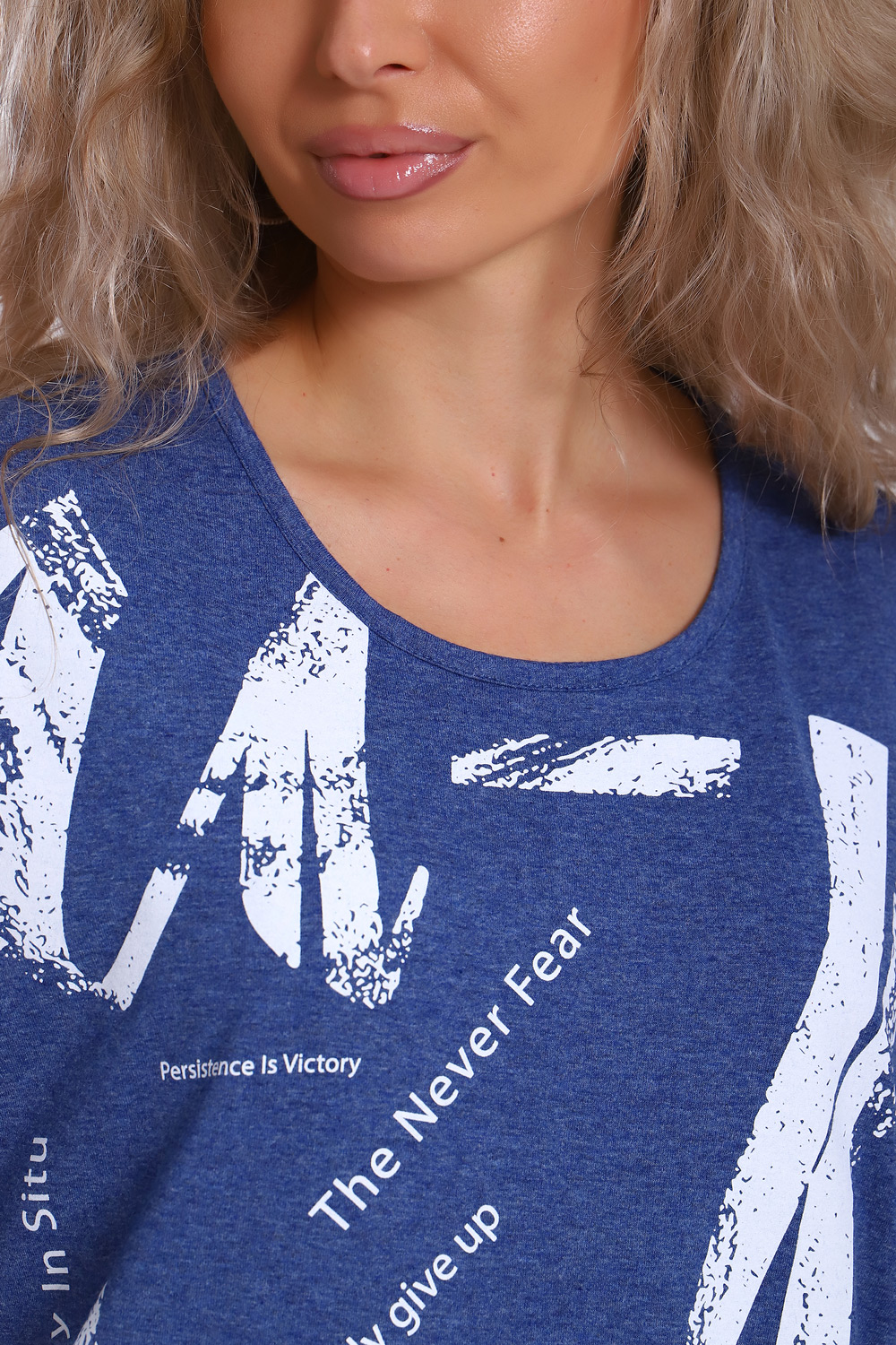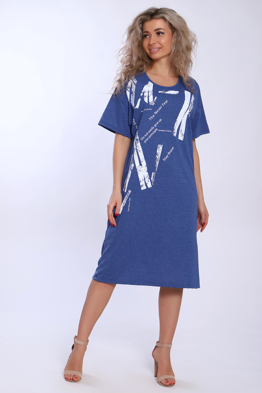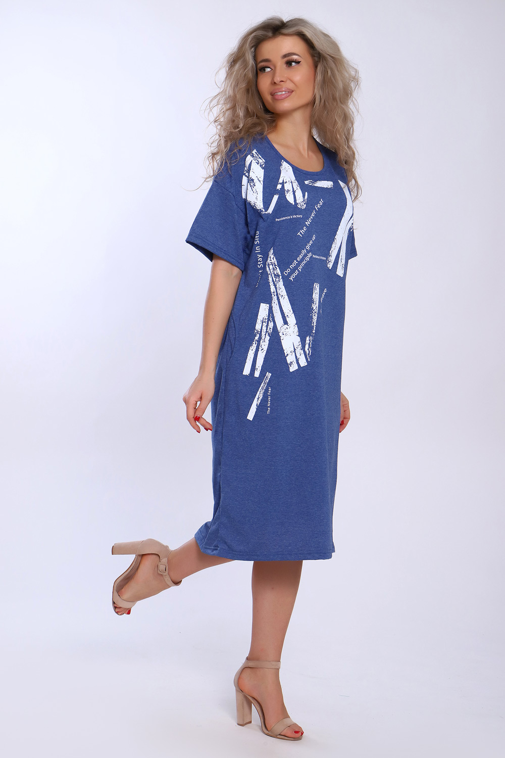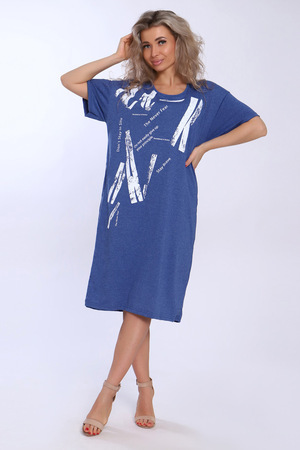 Туника свободного кроя из хлопковой кулирки. На полочке крупный монохромный принт. Рукав короткий на базе спущенного плеча, длина - ниже колена.