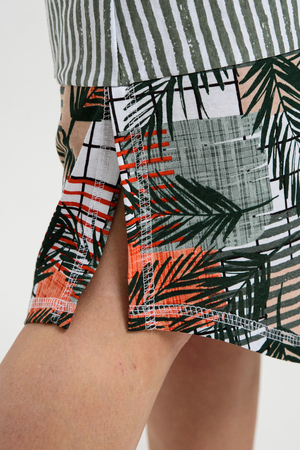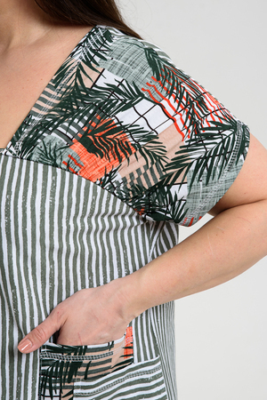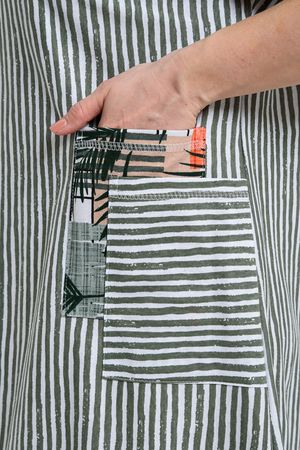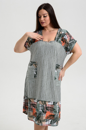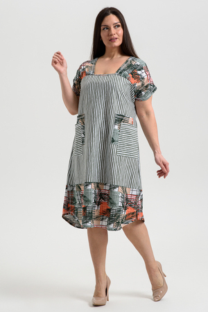 Платье женское полуприлегающего силуэта, слегка расширенное к низу. Кокетка полочки переходит в короткий цельнокроенный рукав, по шву притачивания кокетки к полочке кокетка присборена. Нижняя часть платья из отделочной ткани, сбоку разрезы. На полочке с каждой стороны по два накладных кармана, наложенных и смещенных друг относительно друга из основной ткани и ткани - компаньона. Все карманы функциональны. Свободный покрой и сочетание полосы с отделочной тканью придают платью достаточную комфортность и актуальность.