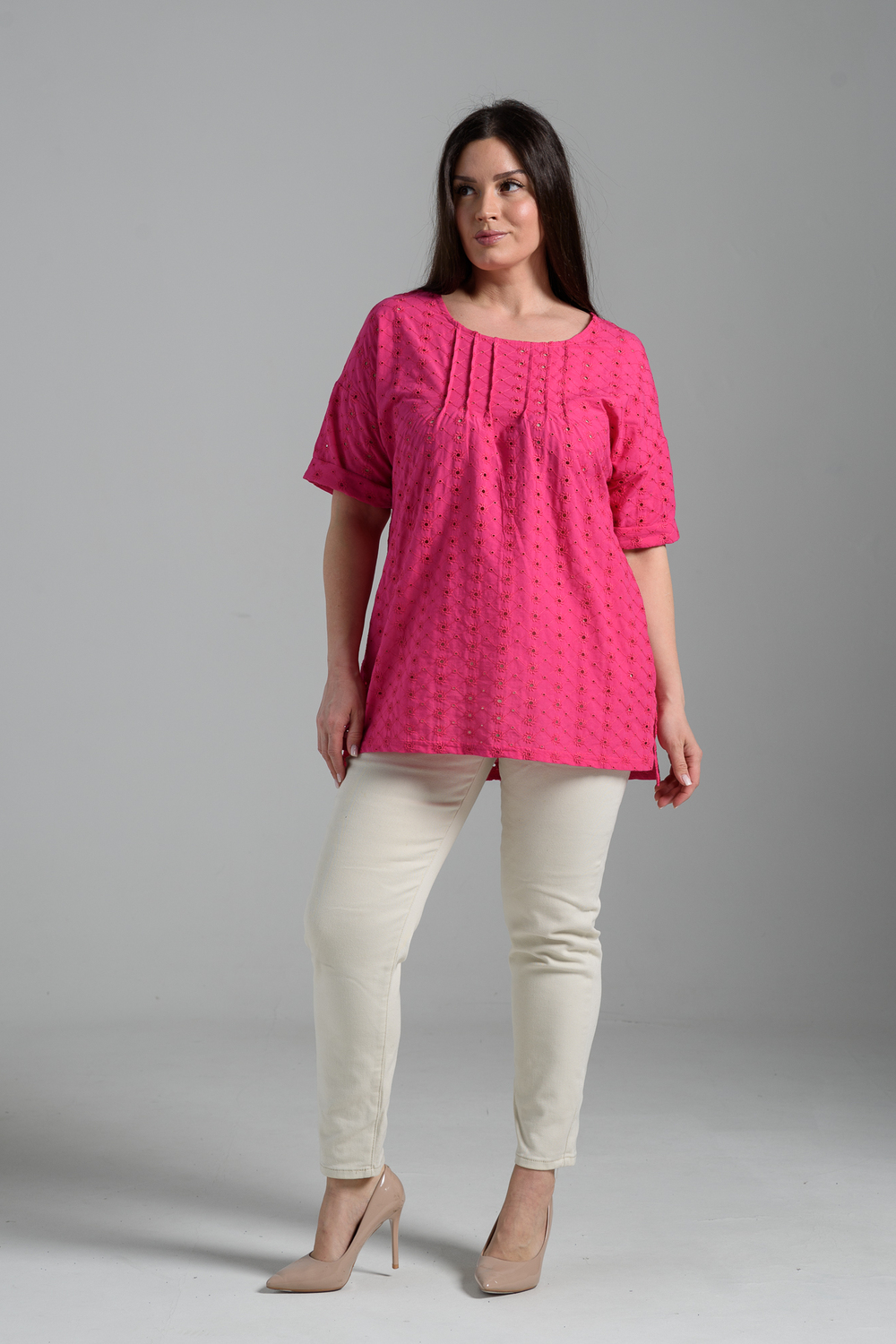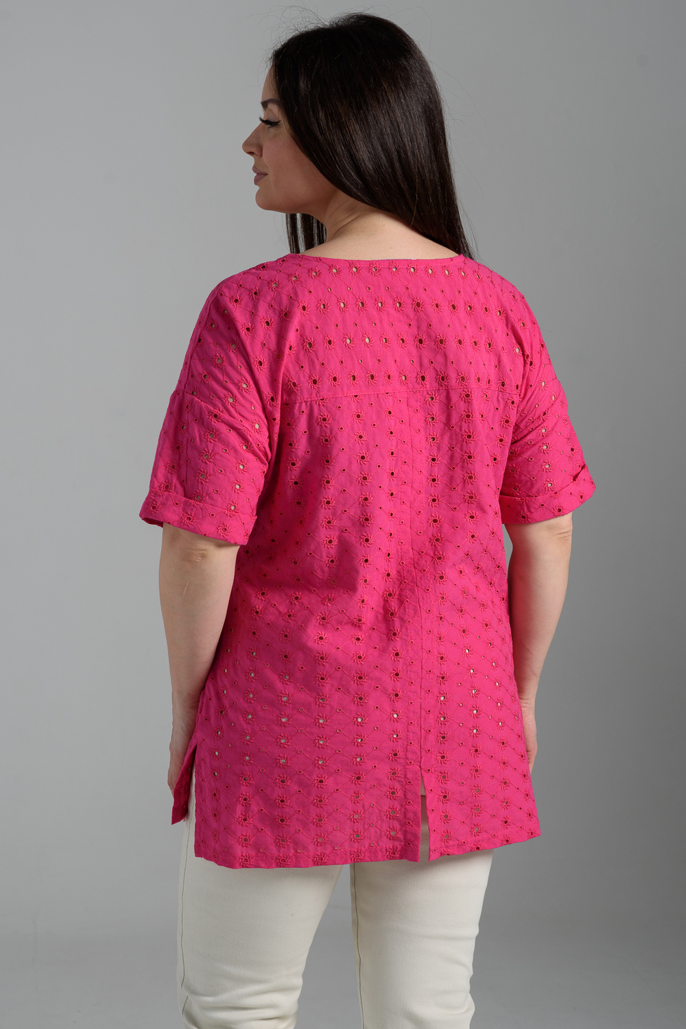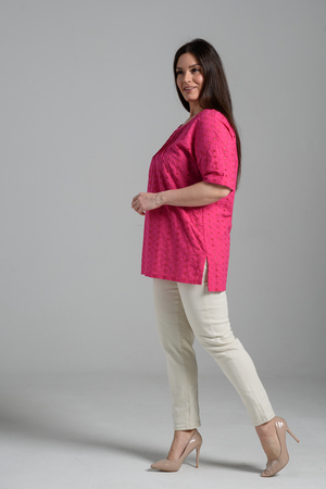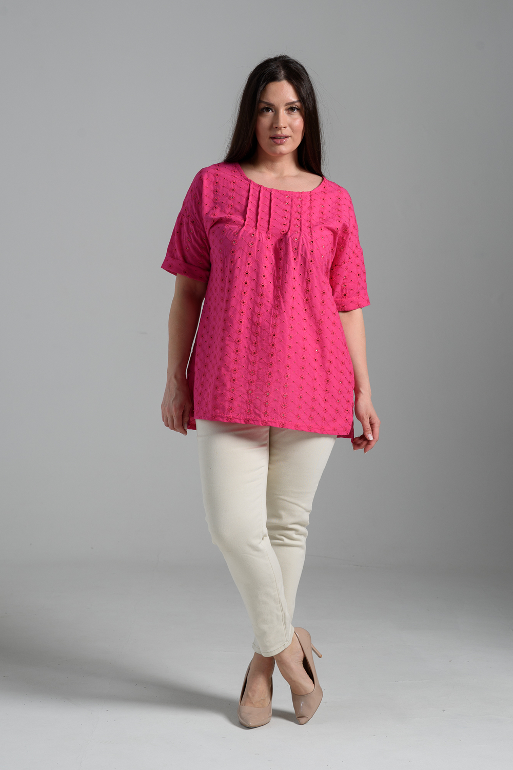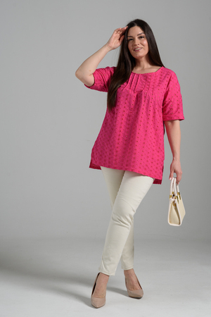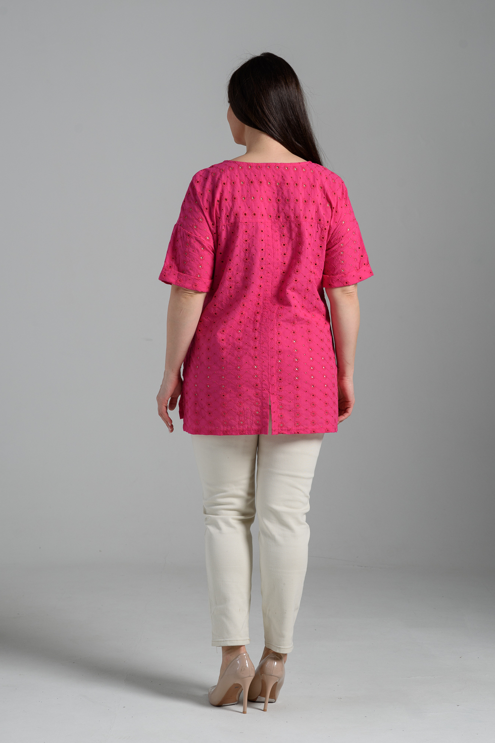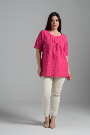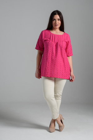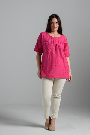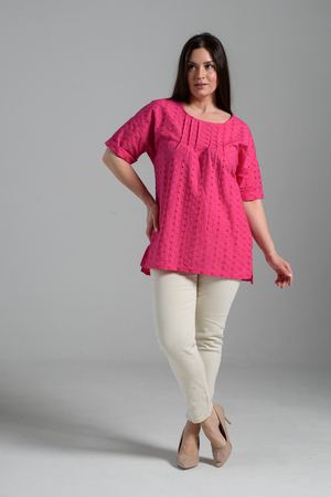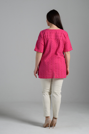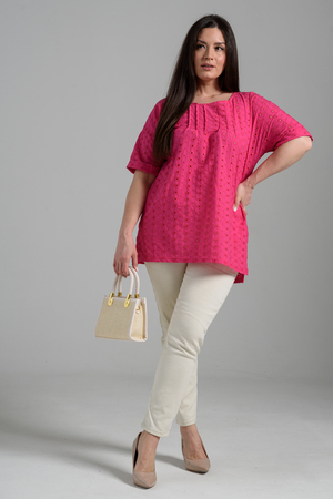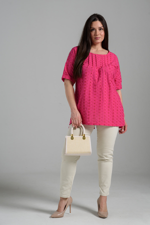 Туника прямая, свободная, с округлой горловиной, с удлиненной спинкой. Рукав короткий, с манжетом. В верхней части полочки обработаны декоративные защипы. Спинка с кокеткой. В нижней части боковых швов расположены разрезы. Горловина обработана бейкой из основного полотна.