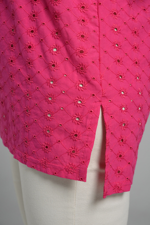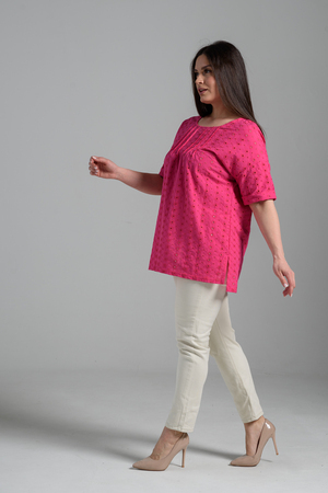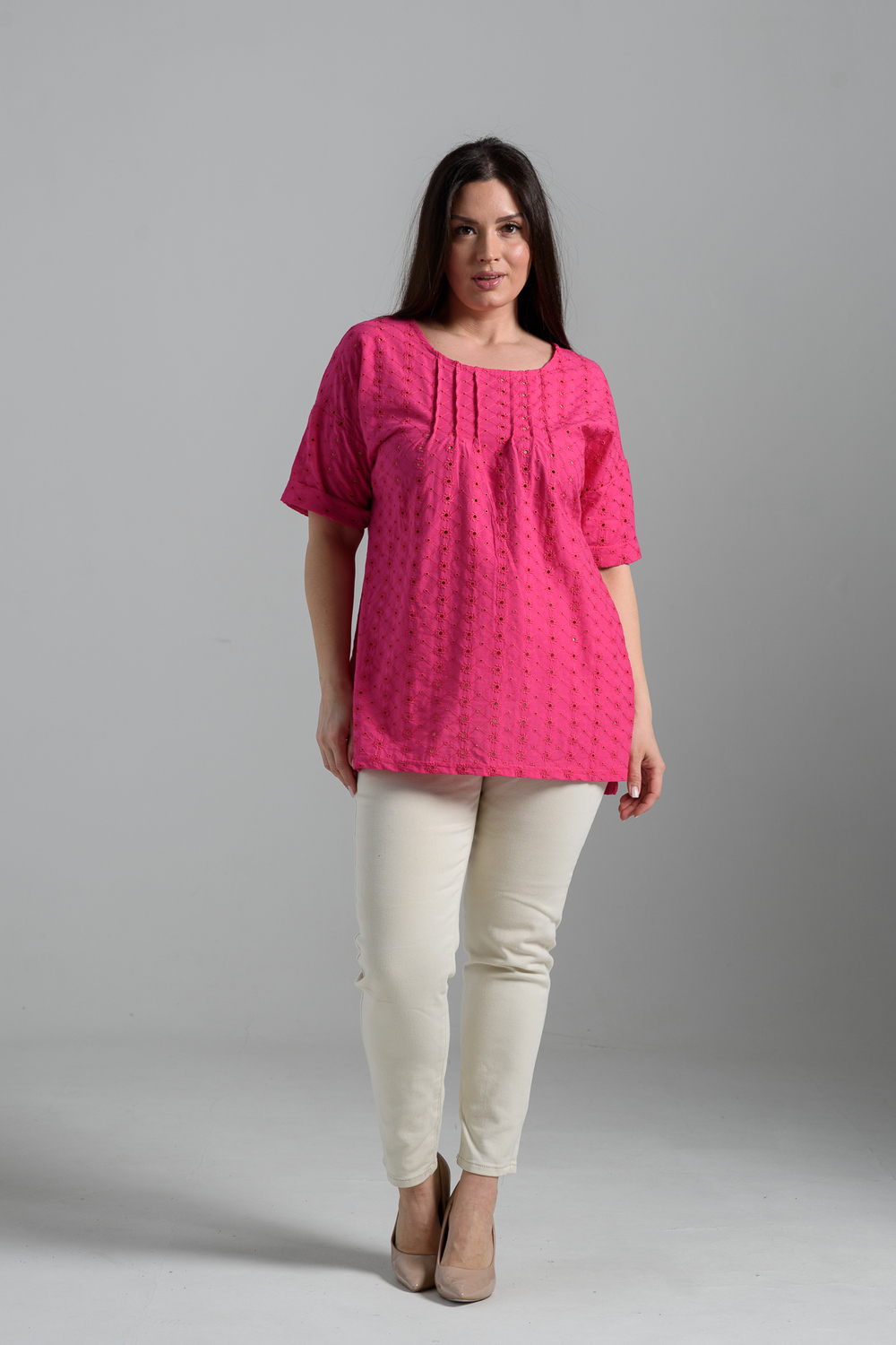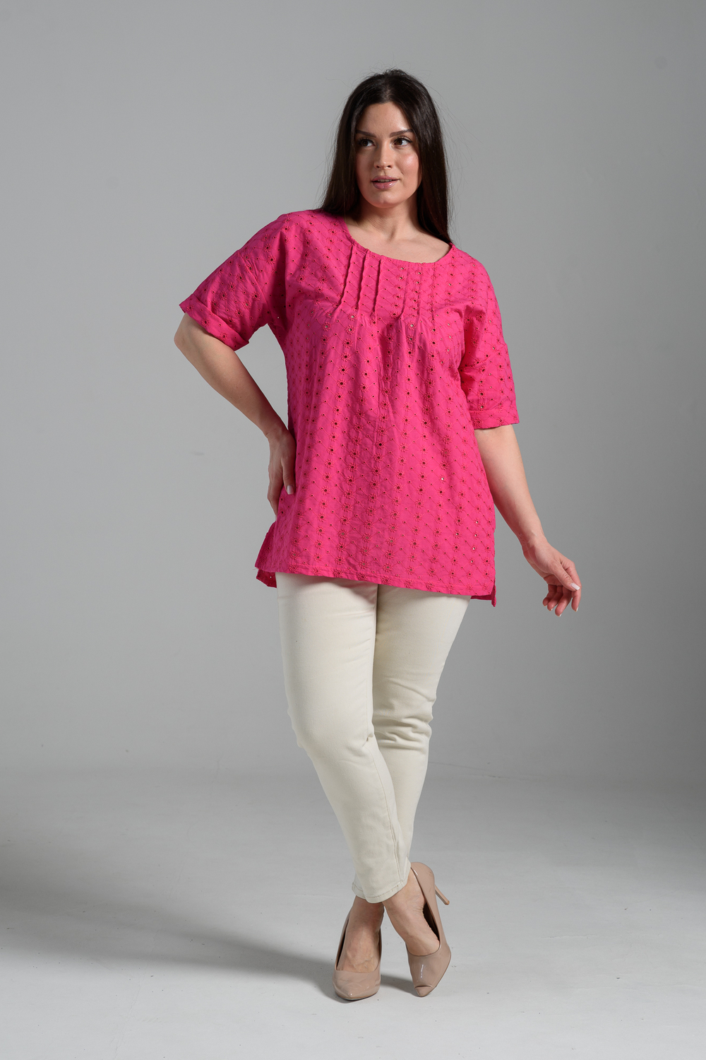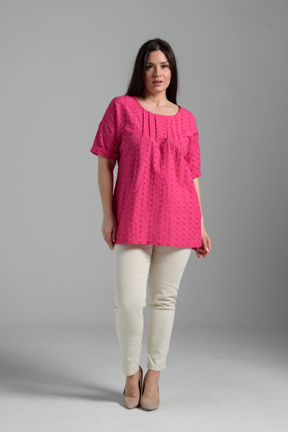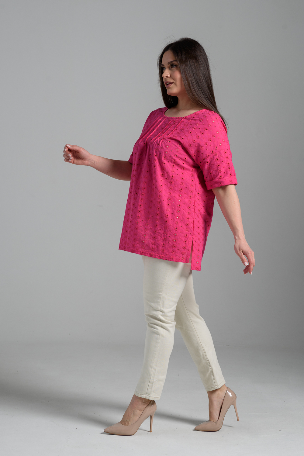 Туника прямая, свободная, с округлой горловиной, с удлиненной спинкой. Рукав короткий, с манжетом. В верхней части полочки обработаны декоративные защипы. Спинка с кокеткой. В нижней части боковых швов расположены разрезы. Горловина обработана бейкой из основного полотна.