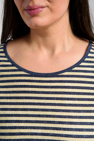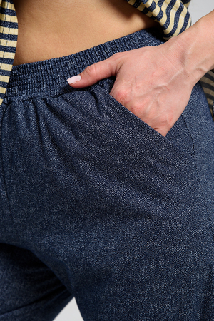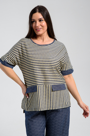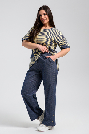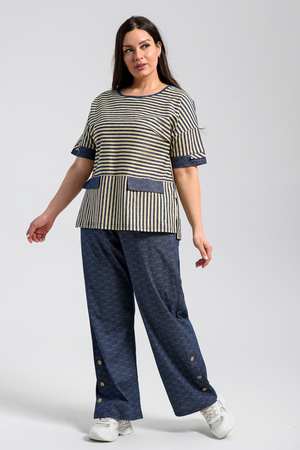 Костюм состоит из туники и брюк. Туника прямого силуэта, с округлой горловиной, с удлиненной спинкой, длиной до середины бедра. Спинка с кокеткой. В нижней части боковых швов обработаны разрезы. Рукав короткий, с манжетом. Горловина обработана бейкой из отделочного полотна. Брюки прямые, свободные, на поясе, с боковыми карманами. В нижней части боковых швов брюк обработаны шлицы с отделочными пуговицами.