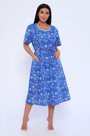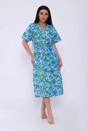 Халат женский, на пуговицах. Ткань - бязь. Спинка цельнокроеная. Полочка с рельефами, вшит карман. Пояс вкруговую. Короткий рукав.