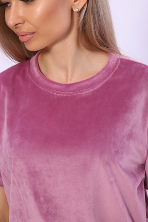Костюм повседневный с шортами из мягкого велюра. В комплект входят: футболка с коротким рукавом с округлым вырезом горловины и шорты с карманами и  поясом на резинке. Удобный велюровый костюм имеет свободный покрой, что делает его универсальной одеждой, которая подойдет на любую фигуру. Он не сковывает движения, скрывает недостатки и подчеркивает достоинства фигуры. Удобные шорты имеют комфортную посадку, резинка не давит, не скручивается, не перетягивает талию. Костюм универсальный, его приятно носить дома и на улице.