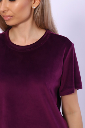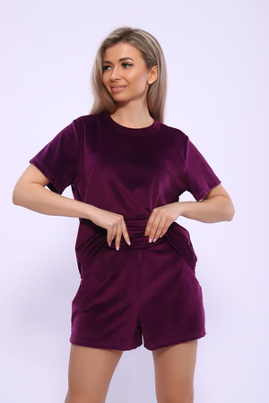 Костюм повседневный с шортами из мягкого велюра. В комплект входят: футболка с коротким рукавом с округлым вырезом горловины и шорты с карманами и поясом на резинке. Удобный велюровый костюм имеет свободный покрой, что делает его универсальной одеждой, которая подойдет на любую фигуру. Он не сковывает движения, скрывает недостатки и подчеркивает достоинства фигуры. Удобные шорты имеют комфортную посадку, резинка не давит, не скручивается, не перетягивает талию. Костюм универсальный, его приятно носить дома и на улице.