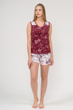 Пижама женская состоит из майки и шорт. Майка прямого силуэта, на широких бретелях, длиной до середины бедер. Горловина округлой формы обработана контрастной окантовкой. Шорты свободные на резинке.