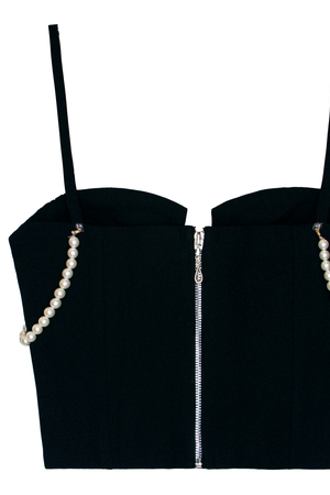 Женский топ корсетный на узких бретелях плотно прилегающего силуэта. Верхняя часть топа оформлена декоративными съёмными жемчужными бретельями. Чашечки на поролоне с косточками, на корсетной части топа используется регилин. Корсет утягивающий дополнен застежкой-молния на спине, что позволяет легко надевать и снимать.
