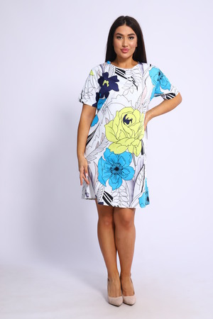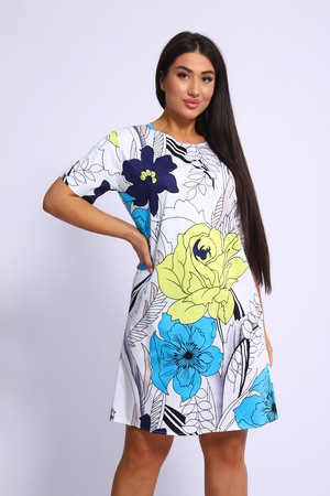 Летнее женское платье свободного силуэта. Изделие с округлой горловиной и коротким рукавом, ткань хлопковая, плотная и не тянется. Хорошо подойдет для повседневной носки.
