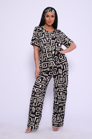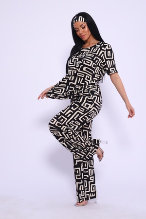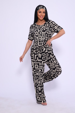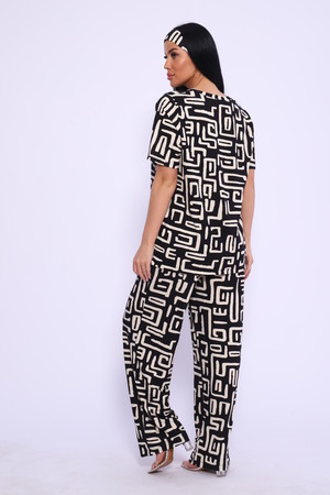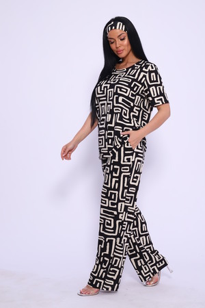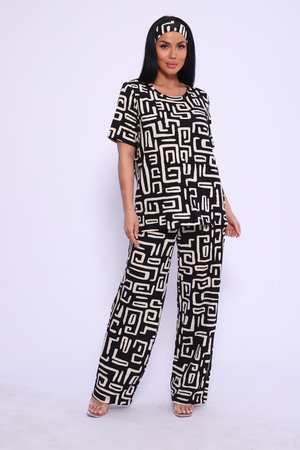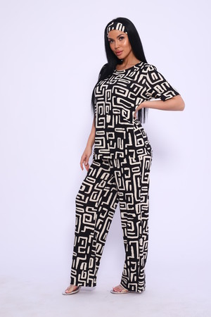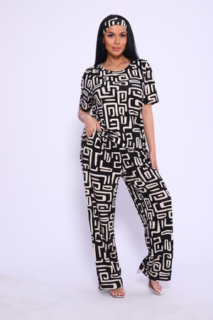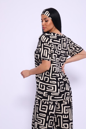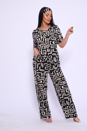 Женский костюм выполнен из вискозы. Костюм с брюками отлично подойдет как для дома, так и для активного отдыха или прогулки. Футболка полуприлегающего силуэта, рукава втачные, округлый вырез горловины. Костюм имеет стильный принт, который придает изделию индивидуальность. Брюки широкие, на поясе с карманами по бокам. Модель для повседневной носки, Вы будете чувствовать себя комфортно и уютно. Рекомендованный режим стирки t 30. ПОВЯЗКА В КОМПЛЕКТ НЕ ВХОДИТ.