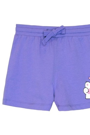 Шорты для девочки прямого силуэта из кулирки. Пояс отрезной в цвет изделия, выполнен из кашкорсе с эластичной тесьмой внутри. По поясу шорт вставлен плоский утягивающий шнурок. Низ изделия обработан швом в подгибку. На передней левой половинке шорт принт шелкография.