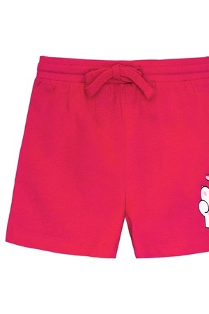 Шорты для девочки прямого силуэта из кулирки. Пояс отрезной в цвет изделия, выполнен из кашкорсе с эластичной тесьмой внутри. По поясу шорт вставлен плоский утягивающий шнурок. Низ изделия обработан швом в подгибку. На передней левой половинке шорт принт шелкография.
