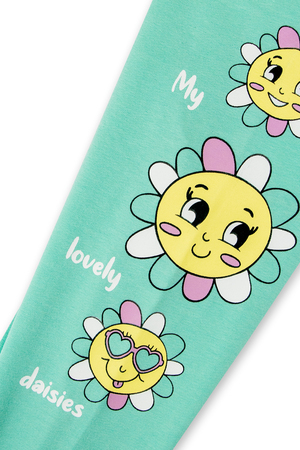 Лосины для девочки прилегающего силуэта. Пояс цельнокроенный, с эластичной тесьмой внутри, закрепленной в шов. Низ лосин обработан швом в подгибку. На левой половинке лосин принт шелкография. Надпись переводится как "Мои любимые ромашки".