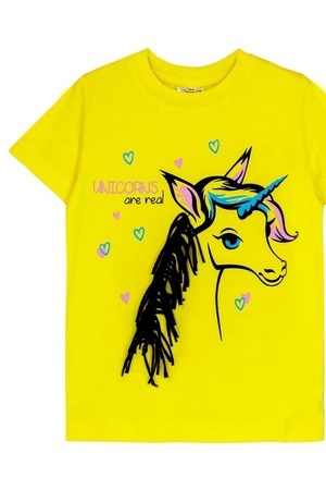 Футболка для девочки прямого силуэта, с втачным коротким рукавом. Горловина круглая, обработана воротником из рибаны. По горловине полочки отделочная строчка. Низ изделия и рукава обработан швом вподгибку. На полочке принт Шелкография с замшевой бахромой. Надпись переводится как "Единороги реальны".