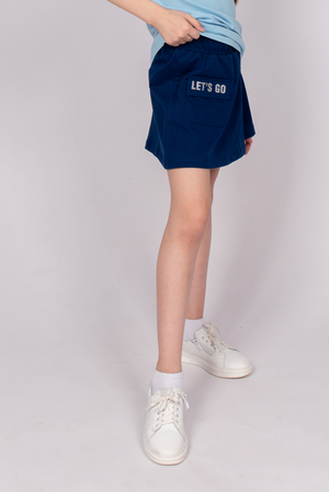 Шорты для девочки прямого силуэта из кулирки с накладным карманом. Пояс отрезной в цвет изделия, выполнен из основного полотна, с эластичной тесьмой внутри. В передней части изделия расположена отлётная часть – имитация запаха, из основного полотна. На отлетной части запаха выполнен накладной карман с клапаном из основного материала. На клапане принт шелкография с глиттером. Надпись переводится как "Вперед". Низ изделия и отлетная часть запаха обработан швом в подгибку.