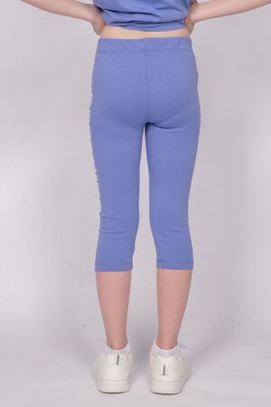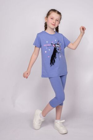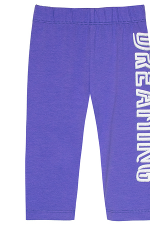 Бриджи для девочки прилегающего силуэта из гладкокрашеного полотна. Пояс цельнокроенный, с эластичной тесьмой внутри, закрепленной в шов. Низ бридж обработан швом в подгибку. На передней половинке бридж принт Шелкография с глиттером. Надпись переводится как "Мечтающая".