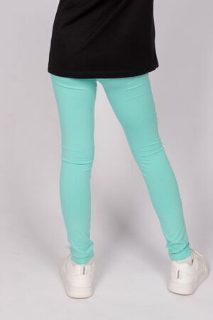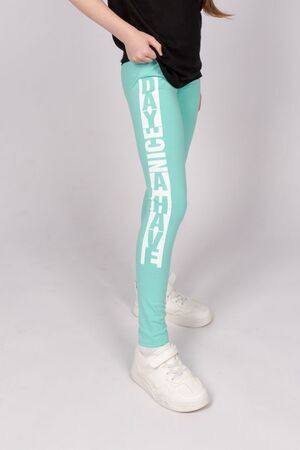 Лосины для девочки прилегающего силуэта из гладкокрашеного полотна. Пояс цельнокроенный, с эластичной тесьмой внутри, закрепленной в шов. Низ лосин обработан швом в подгибку. На правой штанине лосин принт шелкография. Надпись переводится как "Хорошего дня".