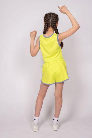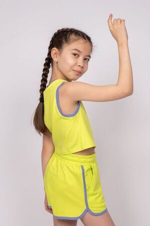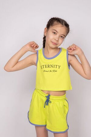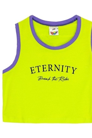 Топ для девочки приталенного силуэта из гладкокрашеного полотна. Линия горловины и проймы круглые, обработана воротником из кулирки контрастного цвета. По горловине и пройме отделочная строчка. На полочке принт Шелкография. Надпись переводится как "Вечность; Разрушай правила".