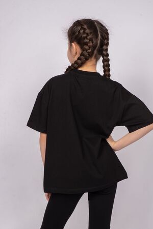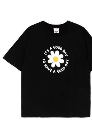 Футболка для девочки свободного силуэта (оверсайз) с коротким рукавом. Горловина круглая, обработана воротником из рибаны. Горловина спинки внутри укреплена бейкой из кулирки. По горловине полочки отделочная строчка. Низ изделия и рукава обработан швом вподгибку. На полочке принт Шелкография со вспенкой и глиттером. Надпись переводится как "Это хороший день; Хоршего дня".