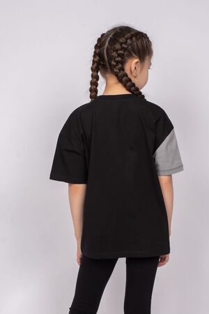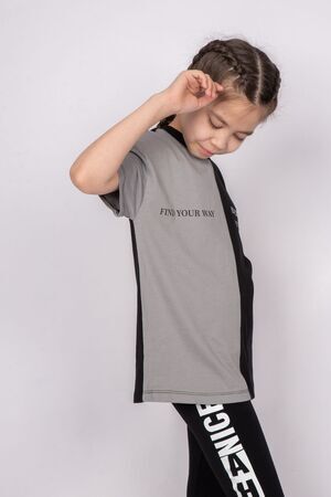 Футболка детская свободного силуэта (оверсайз) с коротким рукавом. Горловина круглая, обработана воротником из рибаны. Горловина спинки внутри укреплена бейкой из кулирки. По горловине полочки отделочная строчка. Полочка состоит из двух частей, контрастного цвета. Низ изделия и рукава обработан швом вподгибку. На полочке принт Шелкография. Надпись переводится как "Найди свой путь; Каждый день-это шанс быть лучше; Сосредоточься на хорошем".