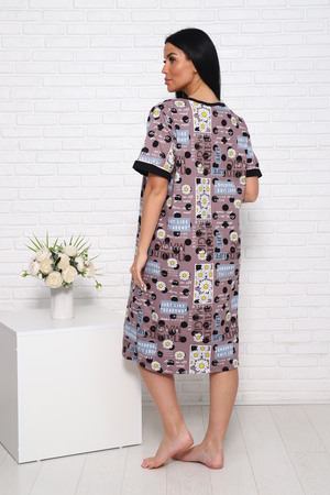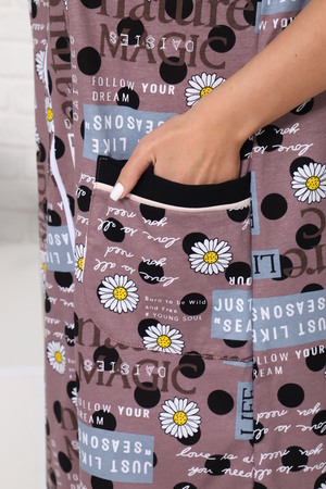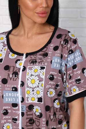Халат женский, выполнен из трикотажного полотна кулирка. Халат свободного силуэта, чуть ниже колен на молнии. Горловина окантована, карманы и рукава выделены отделкой в виде канта.