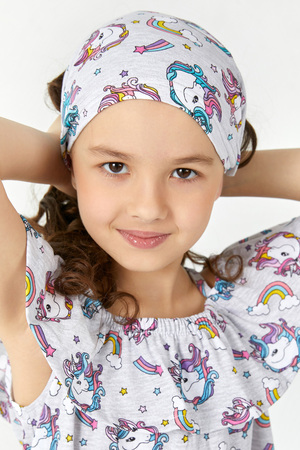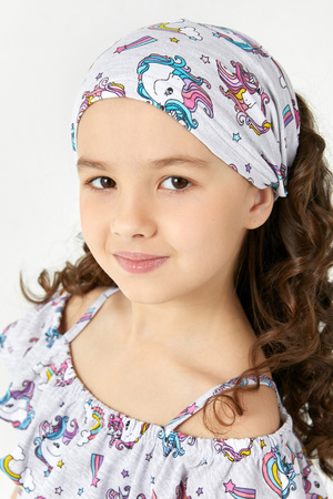 Стильная, яркая косынка для девочек. Встроенная резинка в изделия позволяет косынке прочно держаться на голове. Незаменима в жаркие летние дни.