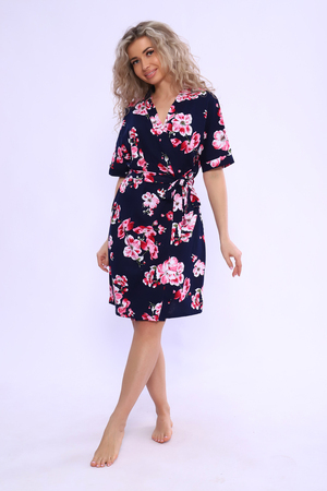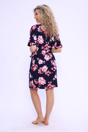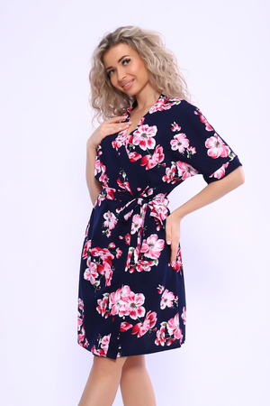 Халат запашной с поясом. Рукава цельнокроеные с манжетами. Карманы в боковых швах.