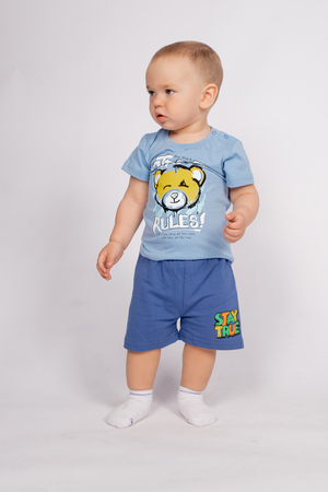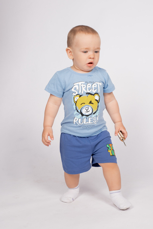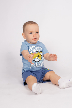 Футболка для мальчика прямого силуэта, с втачным коротким рукавом. Горловина круглая, обработана воротником из рибаны. Горловина спинки внутри укреплена бейкой из кулирки. На левом плече застежка на 2 пробивные кнопки. 1 кнопка на воротнике, 1 по центру плеча. Низ изделия и рукавов обработан швом в подгибку. На полочке принт Шелкография. Надпись переводится как "Правила переулка; Если соблюдать все правила-вы пропустите все самое интересное".