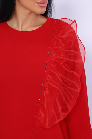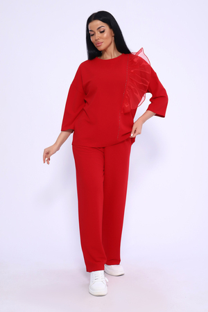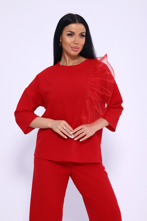 Модель свободного силуэта состоит из брюк палаццо и туники с рукавом 3\4. По переду туники дорожка из страз и оборка из органзы, что делает костюм интересным и эффектным. Брюки с очень удобной высокой посадкой, а туника тоже комфортно и свободно подойдёт практически на любую фигуру. Добавьте этот образ в свой праздничный или повседневный день, и ваша жизнь будет более красочной. В замерах длина рукава указана от начала горловины.