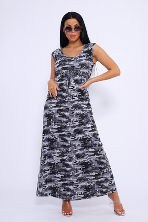 Платье женское с кулиской без рукавов. Изделие выполнено из высококачественного трикотажного полотна (кулирка с лайкрой). Горловина и проймы обработаны окантовкой из основной ткани, низ вподгибку. Полочка и спинка отрезные под грудью, там же проходит кулиска с веревочкой. С правой стороны модели присутствует разрез длиной 57 см.