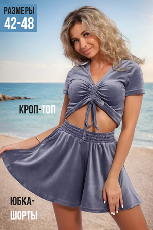 Костюм выполнен из мягкого велюра. Нежный материал придает изделию благородный лоск, а сборка на завязках на груди топа и складки на юбке-шортах образуют роскошные переливы. Облегающий крой топа подчеркнет изгибы вашей фигуры, а укороченная длина акцентирует изящную талию. Юбка-шорты позволяет чувствовать себя уверенно и комфортно, не сковывает движения. Имеет глубокие карманы, позволяющие взять с собой всё необходимое. Юбка-шорты на резинке оригинального фасона, сочетается с любым верхом. Костюм подходит для любых мероприятий, от прогулки по городу, на природе, до танцев и спорта.