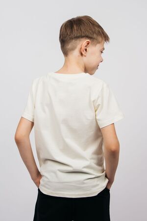Футболка для мальчика прямого силуэта с втачным коротким рукавом. Горловина круглая, обработана воротником из рибаны. Горловина спинки внутри укреплена бейкой из кулирки. Низ изделия и рукава обработан швом вподгибку. На полочке Фотопринт с шелкографией. Надпись переводится как "Наслаждайся каждым моментом; Самый простой способ сохранять спокойствие-лежать под пальмой; Волны позитива".
