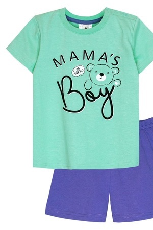 Комплект для мальчика, состоящий из футболки и шорт. Футболка для мальчика прямого силуэта, с втачным коротким рукавом. Горловина круглая, обработана воротником из рибаны. На левом плече застежка на 2 пробивные кнопки. 1 кнопка на воротнике, 1 по центру плеча. На полочке принт Шелкография. Надпись переводится как "Мамин мальчик". Шорты для мальчика прямого силуэта. Пояс цельнокроенный, с эластичной тесьмой внутри. Низ изделия обработан швом в подгибку.