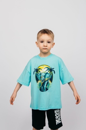 Футболка для мальчика свободного силуэта (оверсайз) с коротким рукавом. Горловина круглая, обработана воротником из рибаны. Горловина спинки внутри укреплена бейкой из кулирки. Низ изделия и рукава обработан швом вподгибку. На полочке принт шелкография.