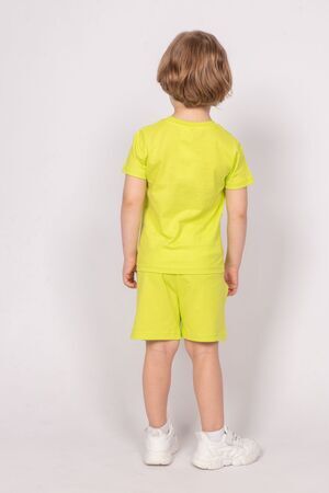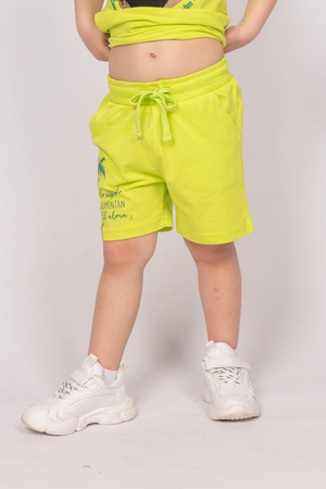 Шорты для мальчика прямого силуэта. Отрезной пояс, в цвет изделия, из кашкорсе с эластичной тесьмой внутри. По поясу шорт вставлен плоский утягивающий шнурок. Длина шнурка = длина пояса + 45 см для возможности завязывания. На передней половинке шорт карманы с отрезным бочком, вход в карман обработан строчкой. Низ изделия обработан швом в подгибку. На правой передней половинке шорт принт шелкография. Надпись переводится как "Путешествия питают душу".