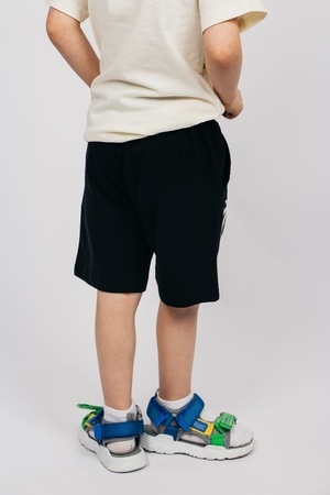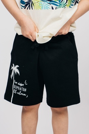 Шорты для мальчика прямого силуэта. Отрезной пояс, в цвет изделия, из кашкорсе с эластичной тесьмой внутри. По поясу шорт вставлен плоский утягивающий шнурок. Длина шнурка = длина пояса + 45 см для возможности завязывания. На передней половинке шорт карманы с отрезным бочком, вход в карман обработан строчкой. Низ изделия обработан швом в подгибку. На правой передней половинке шорт принт шелкография. Надпись переводится как "Путешествия питают душу".