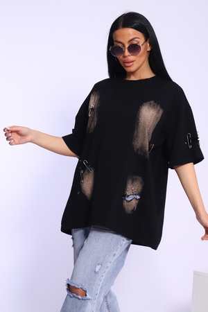 Футболка с булавками oversize - это стильная и комфортная одежда. Изготовлена из хлопка, очень плотная и не просвечивает. Футболка имеет большой размер, что делает ее комфортной и стильной. Она выделается необычным принтом и добавляет в ваш образ изюминку. Футболка удлиненная, что придает ей особый стиль. Идеально подходит на каждый день. Рукав спущенный и не сковывает движения. Длина рукава указана от плечевого шва. Производство Китай.