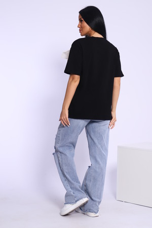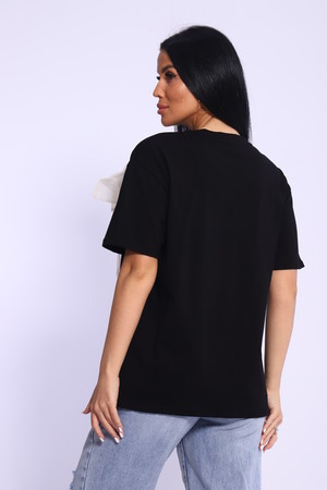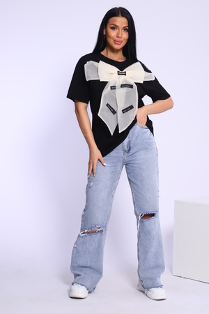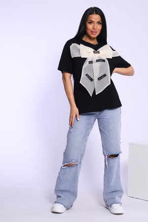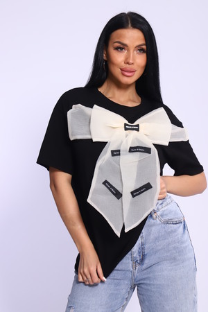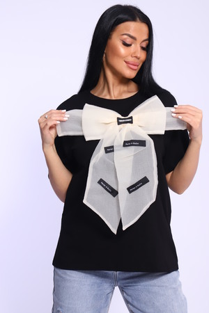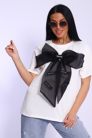 Модная и нарядная футболка с бантом - это стильный элемент вашего гардероба. Бант из тонкой ткани и хорошо держит форму. Футболка с бантом сделает образ изысканным и уникальным. Благодаря уникальному дизайну будет незаменимым элементом вашего гардероба. Подойдет на день рождение, для офиса, как вечерняя, праздничная и повседневная одежда. Рукав спущенный и не сковывает движения. Длина рукава указана от плечевого шва. Перед стиркой вывернуть наизнанку. Производство Китай.