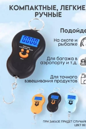 Безмен портативные электронные весы - это удобное и компактное устройство, предназначенное для измерения веса различных предметов. С их помощью вы сможете легко и точно определить массу продуктов, писем, посылок, багажа и многого другого. Одно из основных преимуществ безмен портативных электронных весов - их компактность и мобильность. Устройство имеет размеры, позволяющие легко поместить его в карман или сумку, что делает его идеальным выбором для людей, часто путешествующих или находящихся в поездках. Весы оснащены ярким и легкочитаемым дисплеем, на котором отображается измеряемый вес. Возможность переключать единицы измерения позволяет выбирать наиболее удобный формат для вас - килограммы, фунты, унции или граммы. При заказе придет случайный цвет весов.