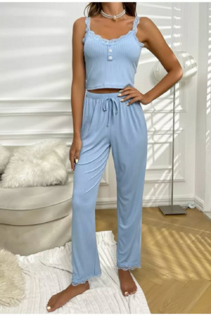 Этот стильный и сексуальный наряд также станет прекрасным подарком для любой женщины, добавляя шарма и уюта в ее гардероб. Не требующая глажки ткань делает эту пижаму практичным и удобным выбором для любого времени года. Почувствуйте себя женственной и уверенной в этой эстетичной пижаме, которая станет вашим незаменимым спутником в уютных моментах отдыха. Этот нарядный комплект включает в себя широкие брюки палаццо и милую майку топ женскую в рубчик, создавая уютный и модный образ. Благодаря трикотажной ткани, пижама обеспечивает идеальную посадку и свободу движений, делая ее идеальной для домашнего отдыха и сна.