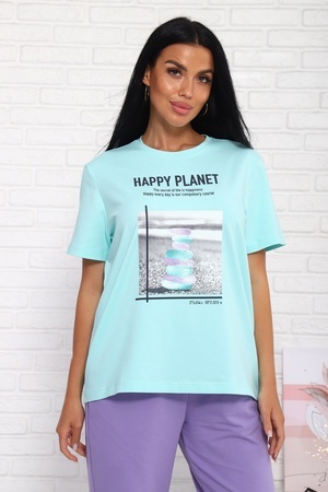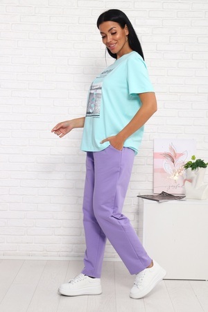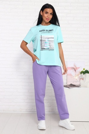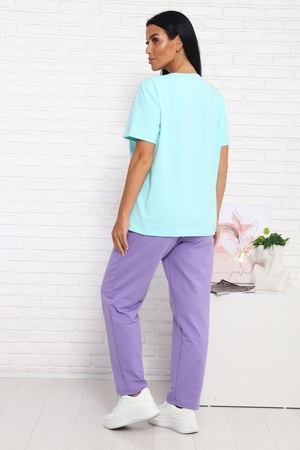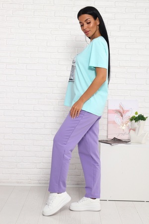 Костюм женский: футболка умеренного объема, удлинённая, прямого силуэта, горловина круглая. Брюки среднего объема, с посадкой на талии. Брюки слегка заужены к низу. По бокам карманы с цельнокроенным бочком.