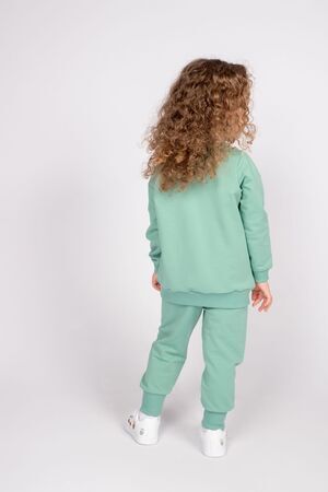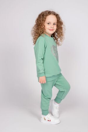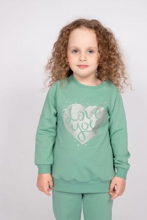 Комплект для девочки, состоящий из джемпера и брюк. Джемпер для девочки прямого силуэта с втачным длинным рукавом. Горловина круглая, обработана воротником из кашкорсе. Горловина спинки внутри обработана бейкой из кулирки. На левом плече застежка на 2 пробивные кнопки. 1 кнопка на воротнике, 1 по центру плеча. Рукав заканчивается манжетом из кашкорсе. По низу изделия пояс из кашкорсе. На полочке принт шелкография с глиттером. Надпись преводится как "Люблю тебя". Брюки детские прямого силуэта. Пояс цельнокроенный, с эластичной тесьмой внутри. По низу изделия манжеты из кашкорсе.