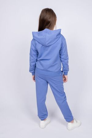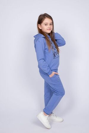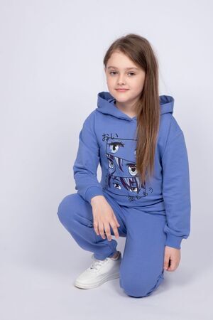 Комплект для девочки, состоящий из джемпера и брюк. Толстовка прямого силуэта со спущенным длинным рукавом. Горловина круглая с капюшоном. Капюшон состоит из 2 половин, в цвет изделия. Горловина спинки внутри обработана бейкой из кулирки. Рукав заканчивается цельнокроенным манжетом с резинкой внутри. На полочке принт шелкография. Надпись переводится как "Привет; Давай веселиться; Мои друзья". Брюки прямого силуэта. Пояс отрезной, выполнен из основного полотна, в цвет изделия, с эластичной тесьмой внутри. На изделии выполнены карманы с отрезным бочком и отлетной мешковиной. По низу изделия цельнокроенные манжеты с эластичной тесьмой внутри.