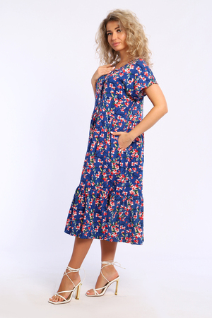 Платье с двумя воланами на сборке и спущенным плечом. На полочке имитация застежки на пуговицы.