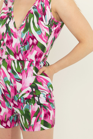 Стильный и универсальный элемент летней одежды - комбинезон с шортами. Верх комбинезона соединён с шортами, тем самым создаётся непрерывный образ. Передняя и задняя части верха комбинезона состоят из двух отдельных элементов, которые соединены на запах, образуя элегантный V-образный вырез. По линии талии для удобства вшита резинка. Шорты свободные, с боковыми карманами. Надевайте его на пляж, носите с топом или купальником. Меняйте образ с помощью ремешков.