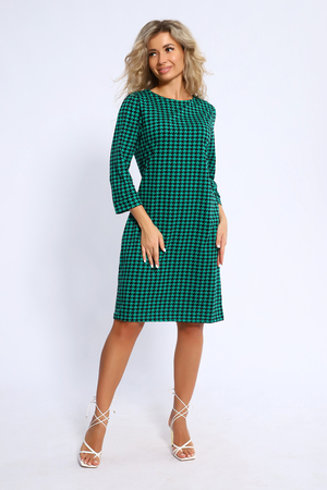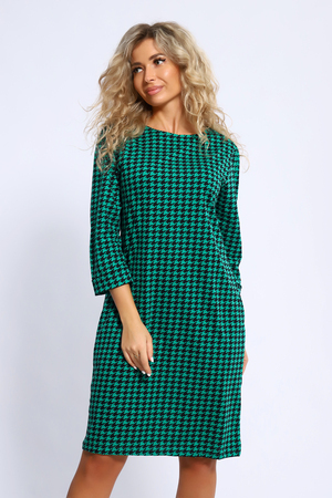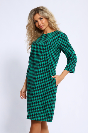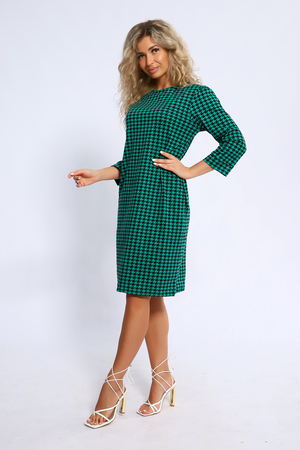 Платье полуприлегающего силуэта с боковыми карманами. Рукава длиной 3/4 с манжетами и на сборке по окату.